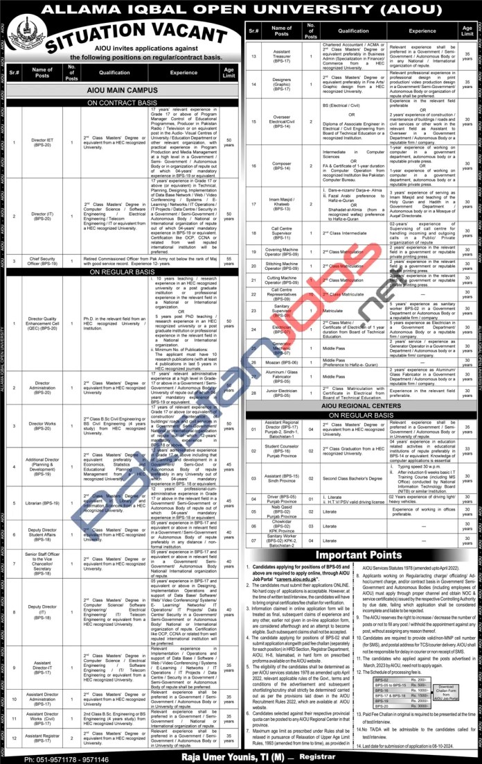 - For positions BPS-05 and above, apply online at the AIOU Job Portal: careers.aiou.edu.pk